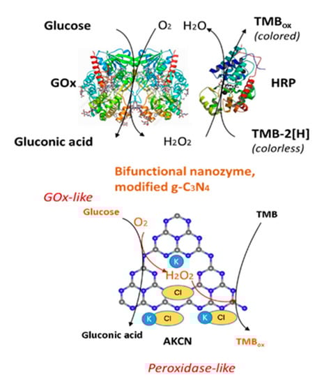- Zhang, P.; Sun, D.; Cho, A.; Weon, S.; Lee, S.; Lee, J.; Choi, W. Modified carbon nitride nanozyme as bifunctional glucose oxidase-peroxidase for metal-free bioinspired cascade photocatalysis. Nat. Commun. 2019, 10, 940. [Google Scholar] [CrossRef]