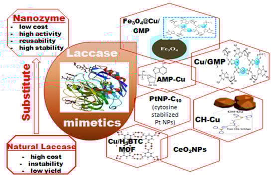 - Liang, H.; Lin, F.; Zhang, Z.; Liu, B.; Jiang, S.; Yuan, Q.; Liu, J. Multicopper laccase mimicking nanozymes with nucleotides as ligands. ACS Appl. Mater. Inter. 2017, 9, 1352–1360. [Google Scholar] [CrossRef] [PubMed]