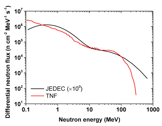 Simulated neutron spectrum of the TRIUMF TNF facility, compared to the JEDEC atmospheric neutron reference spectrum. Accelerated tests were possible at a flux approximatively 109 times higher than on the Earth’s ground.