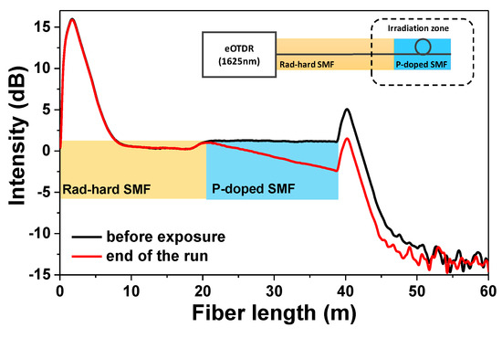 About 18 m of a P-doped single-mode fiber (SMF) from iXBlue (Lannion, France) (see [12,13] for a more complete description of this radiosensitive fiber) was coiled with a 50 mm diameter, a size compatible with the beam homogeneity at TNF. This fiber coil was spliced to a ~20 m pigtail of radiation-hard F-doped SMF from iXblue to enable the signal transport from the neutron-beam zone to the instrumentation zone, where the interrogator, an embedded optical time domain reflectometer (eOTDR) from Viavi Solutions, was located. The eOTDR sent light pulses at 1625 nm through the radiation-hard fiber to the P-doped SMF and measured all along the fiber line the intensities of the Rayleigh backscattered light at the same wavelength. As the SMF is exposed to the radiation, the backscattered light decreases over time, due to radiation-induced attenuation in the radiosensitive SMF. A schematic of the setup is illustrated in the Figure 2 inset. This figure also illustrates the typical OTDR traces acquired before and after irradiation, at a probe wavelength of 1625 nm. The pulse width duration was set to 10 ns (allowing a one-meter spatial resolution), and one measurement point was performed every 4 cm. During the neutron run, one OTDR trace was acquired every minute.