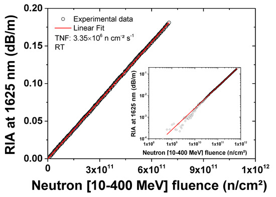 RIA growth at 1625 nm in an 18 m long coil of the P-doped fiber exposed to the TNF neutron [10–400 MeV] fluence at room temperature (RT). In the inset the same results are illustrated in a log-log scale.