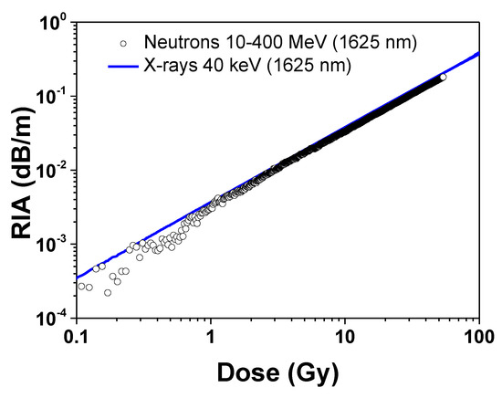 Several previous studies have shown that the main process leading to the generation of point defects in silica-based optical fibers is ionization, whereas displacement damage only marginally contributes to the generation of point defects, except at very high neutron fluences (>1016 n cm−2) [10,14,15]. In the case of P-doped fibers, it has been shown that the infrared optical losses are similar for equivalent doses (usually calculated with Geant4 or FLUKA Monte-Carlo packages) of X-rays, γ-rays, protons or the complex mixed environments of the CHARM facility, a Proton Synchrotron and Proton Synchrotron Booster at CERN [16,17,18]. It is then possible to measure the ionizing dose with the optical fiber, regardless of the complexity of the considered environments in terms of a particle’s nature. For this experiment, and thanks to the FLUKA simulation of the TNF facility, we determined the 1625 nm RIA dependence versus the equivalent dose deposited by the atmospheric neutrons and verified the ability of the fiber to act as a dosimeter in the TNF facility. It should be noted that the neutron capacity to ionize silica is only indirect, i.e., via the creation of secondary particles through nuclear reactions. These secondary particles interact with the atomic electrons and ionize them [19]. The RIA dose dependence is illustrated in Figure 4 and compared to the one measured at the same wavelength under X-rays (at a dose rate of 15.5 Gy/h, average photon energy of 40 keV) from the MOPERIX facility of the LabHC, France. For the neutron tests, we found a radiation sensitivity coefficient at 1625 nm of ~3.36 dB km−1 Gy−1 for this fiber (the fit standard error and Adj. R-Square are of 2.4 × 10−4 and 0.99998, respectively) to be very close to the coefficient obtained at the same wavelength under X-rays: 3.80 dB km−1 Gy−1 (the fit standard error and Adj. R-Square of 2.2 × 10−4 and 0.99992, respectively). The small difference between those coefficients cannot be discussed, as it remains within our experimental and theoretical uncertainties. This demonstrates the ability of the fiber sensor to monitor the equivalent dose, associated with the atmospheric neutrons.