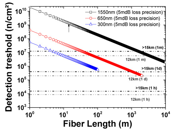 Here, we also consider the different parameters that can be adjusted to optimize the sensor detection threshold. First, the sensitive fiber length can easily be increased, automatically decreasing the neutron fluence detection threshold. The limitation to this approach arises from the fiber’s intrinsic losses at the probe wavelength: here 10 dB of intrinsic losses and 20 dB of intrinsic losses were considered as manageable for distributed OTDR-based sensor and point sensor (laser diode as a source and a photodiode as the detector), respectively. At 1550 nm, with a 10 km fiber coil and assuming that a RIA around ~5 mdB can be achieved with an optimized system, the minimal detectable fluence should be about 106 to 2 × 106 n cm−², which is typically reached in about one week, at altitudes higher than 15 km. It should also be considered that the temperature range during balloon experiments (−60 °C to RT) is quite large, and that, id2ature dependence of the IR-RIA in P-doped fibers at low doses, the preliminary results at higher doses and the dose rate would reveal that the 1550 nm RIA levels are comparable (within 20%) between −40 °C and RT [23]. Another possibility to change the detection threshold is to shift the probe wavelength from 1550 nm to the ultraviolet (UV) or visible domains, where the fiber is more radiation sensitive. Indeed, it has been shown that even if the point defects at the origin of the RIA will be different than at 1550 nm (P1 defects [20]), the P-doped fibers still present some interesting dosimetry properties at around 300 nm (where the P2 defect contribution is preponderant [20,24,25]), and at around 650 nm (where the phosphorus-oxygen hole centers (POHC) defects are the main contributors [20,24,25]), with RIA kinetics being dose rate and temperature (0 to 50 °C) independent at low doses (<100 Gy). The P2 defects are associated with an absorption band that peaked at 275 nm (4.5 eV, FWHM = 1.27 eV), whereas POHC have absorption bands at 563 nm (2.2 eV, FWHM = 0.35 eV) and 496 nm (2.5 eV, FWHM = 0.63). At these two wavelengths, the fibers are more radiation sensitive than at 1550 nm (~3.8 dB km−1 Gy−1) with sensitivity coefficients around 1000 dB km−1 Gy−1 and 100 dB km−1 Gy−1, respectively [24]. Furthermore, a previous study showed that X-rays, γ-rays and 14 MeV neutrons lead to similar RIA levels in the visible domain as well, when normalized to the deposited dose [26]. These results justify our hypothesis that, as for P1 defects in the IR domain, atmospheric neutrons will probably mainly create the P2 and POHC defects through ionizing processes. However, we should also note that at these two wavelengths, the fiber intrinsic losses increase to about 10 dB km−1 at 650 nm and 200 dB km−1 at 300 nm, limiting the lengths of the fiber coil to 2 km and 100 m, respectively. Considering this limitation, our analysis shows that working in the UV domain will probably not allow the fluence detection threshold to be decreased. Optimized sensors operating in the visible should allow an in-situ monitoring of the dose, related to the atmospheric neutrons (and the neutron fluence if combined with radiation environment simulations) on a daily basis at altitudes higher than 15 km.