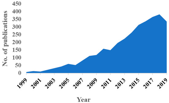Number of publications per year focusing on protein biomarker cancer diagnostics from 1999–2019. Results generated using web of science® report generation tool for “Cancer Protein sensors” on 9 May 2020.