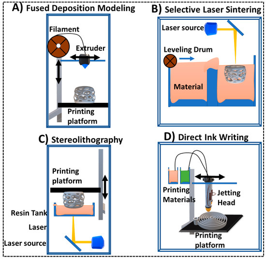 Direct inkjet printing is utilized to deposit materials from inkjet print head onto a build platform or substrate. It depends on the on-demand delivery of adjustable amounts of printable materials onto the printing platform drop-by-drop in a predetermined pattern for layer-by-layer printing. Actuation of material jetting from inkjet head is either thermally or piezoelectrically induced. Thermal jetting requires a heating element that produces a localized heat enough to increase the vapor pressure inside the printing head, leading to ejection of small volume of material. While piezoelectric jetting utilizes a piezoelectric element, which upon application of electric current, generates a mechanical movement enough to eject the ink. An inkjet printing head moving in X, Y and Z directions guides the deposition of a viscous liquid, hydrogel or dispersion onto the printing platform in a desired pattern (Figure 2D) [45]. DIW can be also used to bond powder particles together with the aid of an adhesive polymer [46]. Due to the mechanical ejection mechanism, DIW is time consuming that may take up to a few days for a single print and usually requires post-printing drying. It is utilized for high resolution printing of electronic circuits [47], smooth flexible materials [48], cells and biomaterials [49]. Printing of biomaterials is possible with DIW due to its room temperature piezoelectric printing capabilities and ease of loading into biomimetic printable dispersions.