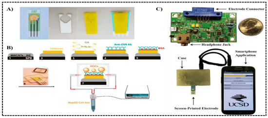 Pre-Fabricated electrodes integrated into 3D printed devices as electrochemical biosensors. (A) From left to right: the screen-printed electrode, adhesive layer, 3D printed microfluidic chamber (yellow), and the assembled device. The device was used for detection of liver cancer cell HepG2. Reproduced with permission from [66]. Copyright (2017) Elsevier. (B) Immunoassay procedures on a multiwall carbon nanotube (MWCNT) modified screen-printed electrode (SPE) (1–5), electrode-embedded 3D printed flow cell (6), and connected to a flow control system (7), and targeting hepatic oval cells (HOCs). Reproduced with permission from [67]. Copyright (2018) MDPI available under Creative Commons Attribution. (C) Printed circuit board module housed in a 3D printed case, with screen-printed electrode inserted, connected to the smart phone for powering, data communication, and display, tracking lung infection in cystic fibrosis. Reproduced with permission from [68]. Copyright (2016) Elsevier.