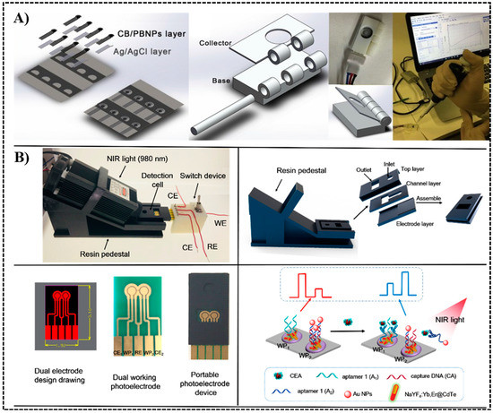 Progress has also been made developing lab-made electrodes, then combining with a 3D printed device. Scordo et al. [69] used wax printing and screen printing to fabricate a paper-based electrode equipped with both reference electrode (Ag/AgCl ink) and working electrode (graphite-based carbon black/prussian blue nanocomposite ink, or CB/PBNBs ink). Preloading the substrate onto the filter paper made this to be an ‘all-in-paper’, ‘reagent-free’ device. A 3D holder was printed by stereolithography (SLA) to house the electrode (Figure 5A). The assay monitored the activity of butyrylcholinesterase using amperometry detection. The sensor achieved a linear range of 1–12 IU/mL with a detection limit of 0.1 IU/mL, and was also tested in serum samples. Tang et al. designed multiple dual (ratiometric) [70,71] and single [72] aptasensors for the detection of carcinoembryonic antigen (CEA), a broad-spectrum biomarker of pancreatic carcinoma, breast cancer and gastric carcinoma, using photo-electrochemistry. The electrode was fabricated from organic or inorganic semiconductors. A 3D printed platform was used to house the whole system (Figure 5B). Photoelectric current was generated by CdTe quantum dots, harvesting light energy from the nanoparticles activated by the near-infrared light. A two working photoelectrode (WP) system was introduced in Figure 5B, where CEA aptamer 1 (A1) was immobilized on WP1, and CEA aptamer 2(A2)-gold nanoparticle conjugate with its complimentary DNA called capture DNA were immobilized on WP2. The binding of CEA to A2 released gold nanoparticles, leading to a signal change between two WPs, from WP1 > WP2 to WP1 < WP2. For detection, the constant potential was set at 0 V and the photocurrent~time curves for both electrodes were recorded. Lowest detection limit achieved in their works was 4.8 pg/mL.