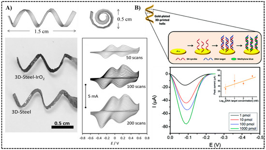 3D printed electrodes as electrochemical biosensors. (A) Dimensions of the helical-shaped IrO2-deposited stainless-steel electrode printed by selective laser melting (SLM) and cyclic voltammograms. Reproduced with permission from [73]. Copyright (2015) Wiley. (B) Gold-Electroplated helical steel electrode used in measuring DNA hybridization. Differential pulse voltammograms at various DNA concentrations are shown. Reproduced with permission from [28]. Copyright (2017) Royal Society of Chemistry.