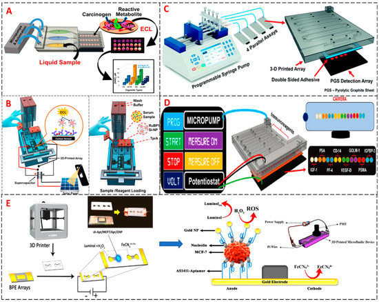 Schematic illustration of 3D printed biosensor arrays that employ electrochemiluminescent (ECL) detection used for cancer diagnostics. (A) Automated 3D-printed ECL microfluidic array used in genotoxicity screening Reprinted with permission from Copyright (2017) American Chemical Society. (B) Automated 3D printed supercapacitor-powered ECL Protein Immunoarray. Reproduced with permission from [90]. Copyright (2016) Elsevier. (C) Automated 3D printed microfluidics immunoassay detecting 4 protein samples simultaneously. Reproduced with permission from Copyright (2018) The Royal Society of Chemistry. (D) Automated 3D printed microfluidic array for detection of 8 cancer biomarker proteins simultaneously. Reproduced with permission from [90]. Copyright (2018) American Chemical Society. (E) Complete pathway to the detection of human breast cancer cells by using bipolar electrode modified by an aptamer coated inside a 3D printed microchannel by ECL. Reproduced with permission from [92] Copyright (2018) Elsevier.