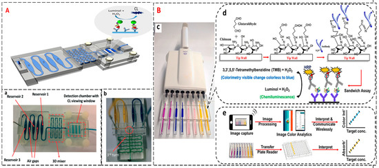 We reported the first non-polydimethylsiloxane (PDMS), transparent 3D printed device with channels, detection chamber and reagent mixer (Figure 8A) integrated with an immunoarray in 2017 to measure protein biomarkers. Proteins PF-4 and PSA were studied in this example, giving LODs of 0.5 pg/mL for both along with broad dynamic ranges [109]. We also developed an assay using CL for multiplexed ELISA in 3D printed pipette tips (Figure 8B) [29]. Both colorimetric and chemiluminescence detection methods were considered in the novel TIP ELISA approach. A smartphone was utilized to enable the electronic delivery of results proving it to be suitable for POC testing. The immunoassay was done in the side of the pipette tips. It proved to be more sensitive, faster and required less sample and reagent volumes than traditional ELISA assays. Four prostate cancer biomarkers were studied giving LODs down to 0.5 pg/mL concentration level. The results showed good correlations with ELISA cutting down the cost to less than 25% of conventional ELISA. Other 3D printed systems that have been developed that detect lactate and H2O2 in biological fluids and plant extracts.
