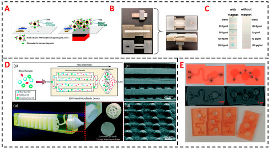 (A) Schematic representation of effect of magnetic focusing on a lateral flow assay resulting in enhanced density of magnetic probe-labelled target in the capture antibody detection zones. Effect of magnetic focus represented with and without magnets underneath lateral flow (LF) device to show improved accumulation compared to conventional lateral flow assay (LFA). (B) 3D printed device that acts like a frame to hold the lateral flow strip along with magnet and a sample addition zone for liquid biopsy sample aimed to detect cancer biomarkers. (C) Comparison of colorimetric signal as detection results with and without magnet. Reproduced with permission from [111]. Copyright (2019) American Chemical Society (D) Schematics of tumor cells enrichment process in a multi-layered immunocapture microfluidic layer. Microposts inside the microfluidic channels assist structural integrity and enhanced surface area to allow higher capture and enrichment efficiency. 3 µM membrane filter to retain all eluted nucleated cells for downstream applications. Reproduced with permission from [112]. Copyright (2019) The Royal Society of Chemistry (E) Images of 3D printed modular chips made from DLP based stereolithography based approach where monomeric resin is doped with acrylic acid to generate a platform that has intrinsic carboxylates for direct conjugation of biomolecules. Reproduced with permission from [113]. Copyright (2019) The Royal Society of Chemistry.