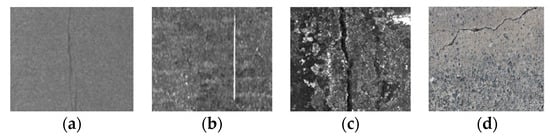 Statistical textures examples. (a) Hot-rolled steel strips surface, homogeneous; (b) Con-casting slabs surface, homogeneous; (c) Con-casting slabs surface, inhomogeneous; (d) Bridge deck inhomogeneous.