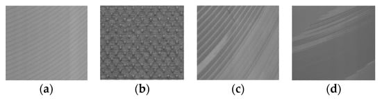 Texture analysis provides a very powerful tool to detect defects in applications for visual inspection, since textures provide valuable information about the features of different materials []. In computer vision, texture is broadly divided into two main categories: statistical and structural. As shown in Figure 1, statistical textures are isotropic and do not have easily identifiable primitives. In contrast, structural (or patterned) textures are characterized by a set of repetitive primitives and placement rules, as shown in Figure 2. Both the statistical and structural textures appear as homogeneous (Figure 1a,b and Figure 2a,b) or inhomogeneous (Figure 1c,d and Figure 2c,d). It should be noted that Figure 1d and Figure 2b are respectively quoted from Reference [] and Reference []. As can been seen, the milling surface we deal with features structured homogeneous or inhomogeneous textures (Figure 2a,c,d).