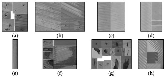 Samples of different defects: (a) Slag inclusion (SI); (b) Pitted slag inclusion (PSI); (c) Adhesion aluminum (AA); (d) Scratches (Sc); (e) Crack (Cr); (f) Oxide film (OF); (g) Mosquito (Mo) and aluminum chips (AC); (h) Texture background (Tb).