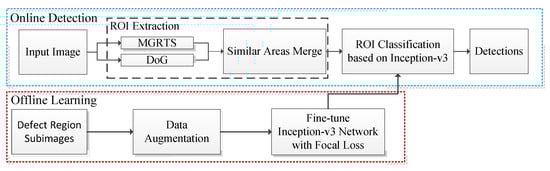 In this section, the proposed two-stage surface defects detection method will be introduced in detail. Since there is no similar defect database, at the beginning of the project, we need to preliminarily detect the area of interest and collect defect samples. Therefore, we cannot use the end-to-end network which needs a large number of labeled defect images; instead, we design a two-stage target detection method. As shown in Figure 4, the proposed method has two main components: (1) ROI extraction based on the combination of MGRTS, DoG, and similar area merge, and (2) defect ROI classification.