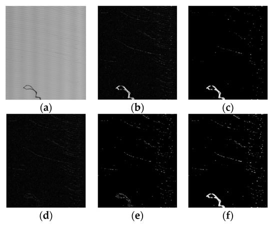 As shown in Figure 5, the original image (Figure 5a) contains aluminum chips and scratches, and Figure 5b is the gradient response map based on the Sobel operator. By using iterative threshold segmentation guided by mask gradient response maps, the defect areas (Figure 5f) are segmented from the gradient map. In each iteration, adaptive threshold segmentation is realized by Equation (1) and Equation (2).
