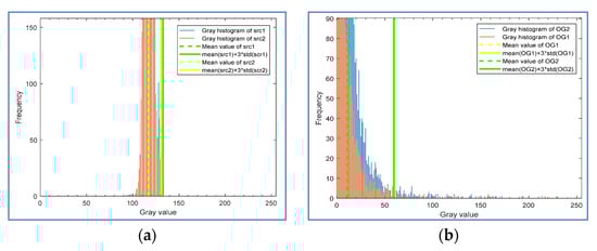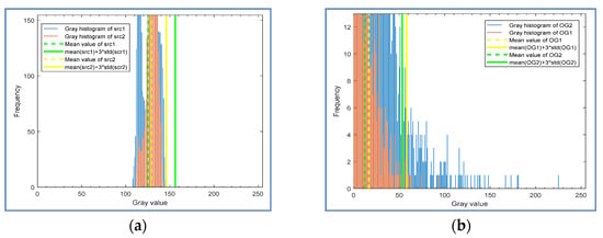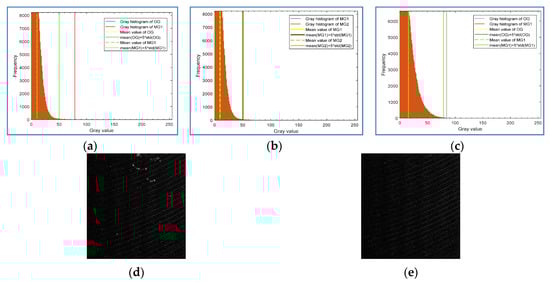 It can be observed that after the first threshold segmentation, the statistical information value g0 (red solid line in Figure 6a) of OG is very different from that (g1) of MG1 (green solid line in Figure 6a), and g0 − g1 = 28.3, so the second threshold segmentation is needed. Figure 6b shows that after the second threshold segmentation, the statistical information value g1 of MG1 (red solid line) and the statistical information value g2 of MG2 (green solid line) have almost no difference, so the iteration can be ended. Figure 6c shows the distribution of statistical information of another sample after the first iteration of threshold segmentation. Figure 6d,e are the gradient map OG and MG1, respectively. For this sample, one segmentation is enough, so the distance (5.78) between g0 and g1 in Figure 6c provides a reference for the selection of the threshold.