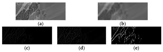 The construction of D(x, y) for a surface defect image of aluminum ingot is shown in Figure 7. Figure 7a is the original image with an oxide film defect. Figure 7b is the fuzzy effect image after convolution of the Gaussian function with an original image. The Gaussian window is set as 45 according to the experiment. Figure 7c is the response map of the DoG calculated by Equation (8). In the collected image of an aluminum ingot surface, the gray value of the defect area is lower than the texture background in varying degrees, so this paper uses to reduce the influence of the background. Figure 7d shows the result of , which introduces a part of the texture response compared with Figure 7c. Figure 7e is a binary image after segmentation with a fixed threshold, and it will be combined with the result image of MGRTS by a logical OR operator.