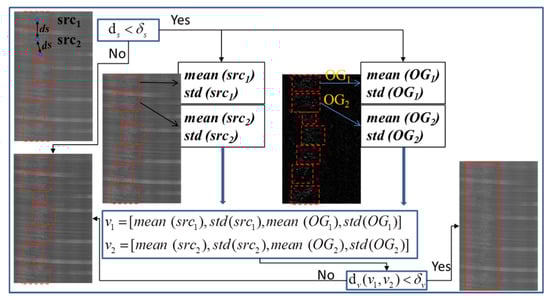 If the two windows overlap, or the spatial Euclidean distance ds (refer to Equation (9)) between their center points (p, q) is very close and less than the threshold , the information distribution vectors , will be extracted, and the Euclidean distance dv (refer to Equation (10)) will be calculated.