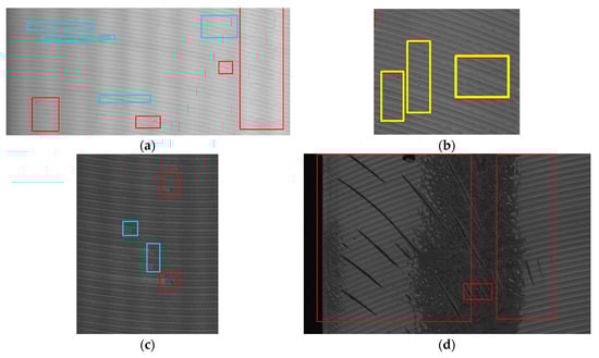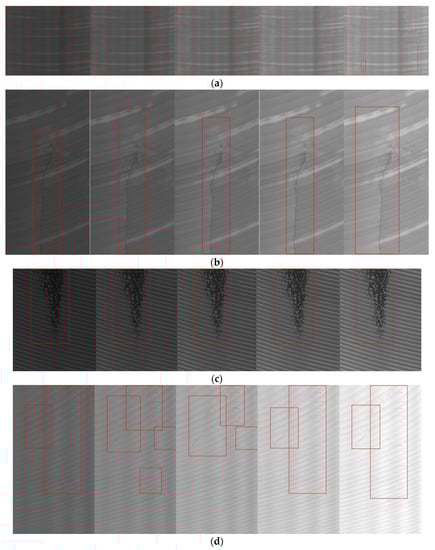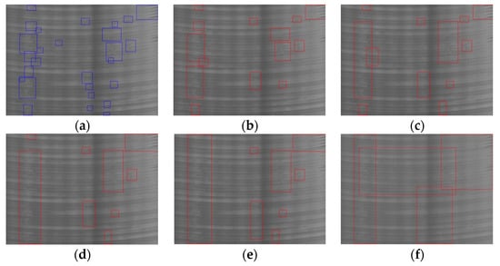 If the distance is less than the threshold , the two windows will be merged. After testing the effect of different values on the merge results from similar areas, we set to 150. As shown in Figure 12, the similar areas merge results are insensitive to the value of . For the pitted slag inclusion defect in this paper, it is better to set the threshold to 150. It is recommended to set the higher, as it ensures that similar areas will merge together as much as possible. Thus, defect ROIs can be completely detected, and the reduction of the ROI number will help to improve the speed of subsequent classification.
