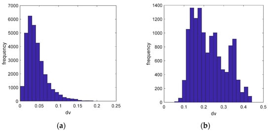 The Euclidian distance (dv) histogram of similar areas and dissimilar areas: (a) Similar areas distance histogram; (b) Dissimilar areas distance histogram.
