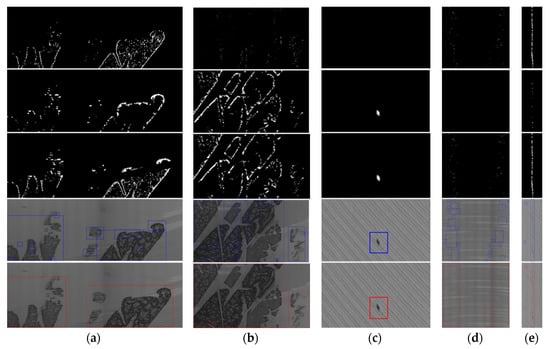 We also experimented to test the ROI extraction effectiveness of MGRTS and DoG, and the performance of the algorithm that merges similar areas. Figure 16 shows a few representative results of different defects including oxide film (Figure 16a,b), oil stain (Figure 16c), pitted slag inclusion (Figure 16d), and crack (Figure 16e). The first line of Figure 16 is the binary response map of the MGRTS, the second line is the binary response map of DoG, and the third line is the result of adding the response map of MGRTS and DoG. As shown in Figure 16b, the MGRTS failed to segment the large-scale defect completely, and MGRTS also failed to detect the oil stain in Figure 16c, which is mixed in a dense texture background, but the DoG algorithm makes up for these two disadvantages. The fourth line of Figure 16 shows the enclosing rectangle of each defect area obtained by contour extraction after morphological expansion, and the last line is the final ROI bounding box after merging similar regions. It can be seen that for large-scale defects (Figure 16a,b) and distributed defects without obvious boundaries (Figure 16d), the similar region merging algorithm can integrate local regions to obtain a complete bounding box, which also reduces the number of ROI windows and improves the classification efficiency and accuracy.