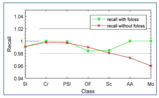 In order to verify the ability of focal loss to deal with sample imbalance, we compared the classification effect of using cross entropy loss and using focal loss in an inceptions-v3 network. Figure 17 shows the recall curve of the two methods for each type of defect on the test set. From the green curve in the figure, it can be seen that inception-v3 with focal loss significantly improved the recall rate of adhesion aluminum and mosquito defects with a relatively small number of samples.