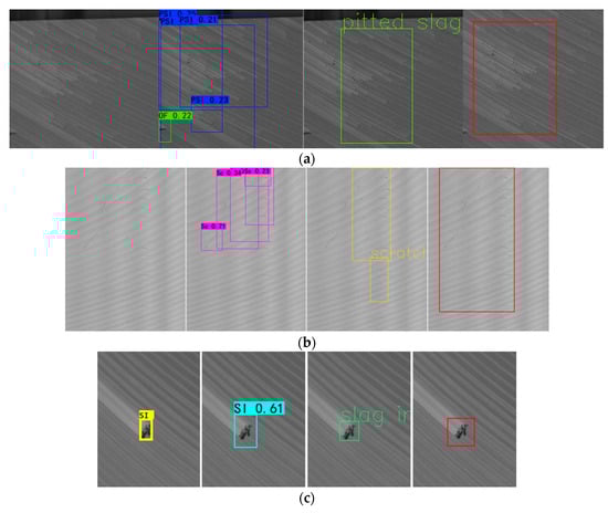 Table 4 compares the recall (R), precision (P), and F1-score (F1) of the four methods for each type of defect. At the same time, the reasoning time of each algorithm is also listed. In experiments, the top-1 strategy was used in the statistics of detection results, and no threshold was set for the score. The average recall rate and precision of the algorithm in this paper are over 92.0%, but when influenced by a scratch defect, the average recall rate of YOLOv3 is only 66.1%. Meanwhile, RetinaNet is worse in detecting Cr defects. On the whole, the metrics of YOLOv4 are high, but similar to YOLOv3, the recall rate of scratch defects is low. Our algorithm has a relatively low recall and precision for the defects of pitted slag inclusion. The reason is that the resolution of some defects in the image is low, which affects the accuracy of defect classification. It can be seen from Table 4 that our algorithm achieves the highest F1-score and the shortest inference time.