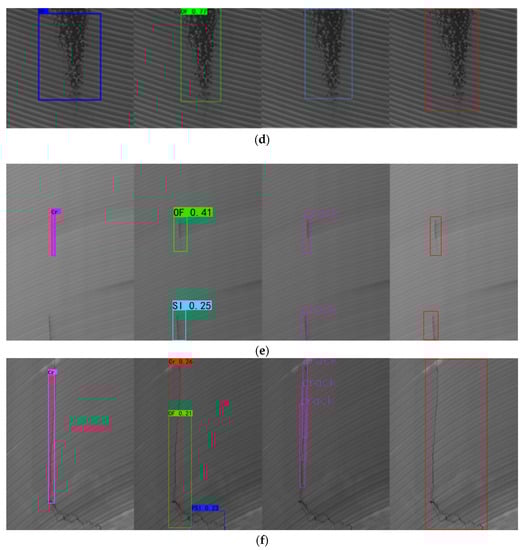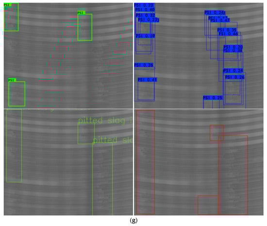 Detection effect of different methods: (a) PSI; (b) Sc; (c) SI; (d) OF; (e) Cr; (f) Cr; (g) PSI. The detection results of YOLOv3, RetinaNet, YOLOv4, and our method are shown from left to right in each group of comparison images.