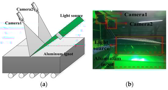 Figure 21a shows a concise diagram of the imaging system, and Figure 21b is the corresponding picture of the material object. The image acquisition device includes cameras and a light source. Two line-scan charge-coupled device (CCD) cameras are used to capture images of 4096×1024 size of an aluminum ingot surface after milling under the illumination of light source, and the resolution is 0.315 mm/pixels. When the aluminum ingot passes through the acquisition device, the image acquisition program will control the acquisition speed of the camera according to the production speed and store the image. At the same time, the defect detection algorithm starts to process the image, and it alarms in time when defects are found.