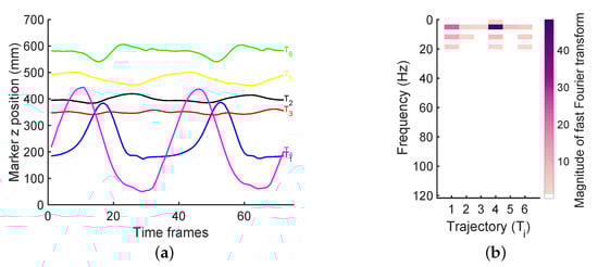 (a) An example set of marker trajectories from human gait data. (b) The corresponding frequency components.