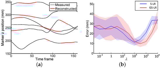 Figure 3a shows a subset of corrupted trajectories (z coordinate only) from the WalkL dataset where measured parts are shown with black lines. The reconstructed parts are based on the GS-LR method. In order to evaluate the impact of the sparse regularization, we reconstructed the WalkL dataset for various values of (Figure 3b). Figure 4 illustrates the reconstruction error distributions for the first (use of 37 markers) and second (use of 11 markers) test settings applying three methods. We compared the performance of each method (Table 1) using the pairwise Wilcoxon signed rank test, with a statistical significant set at the 95% confidence level (). In Table 1, results indicate that, when all marker trajectories are available, our S-LR and GS-LR methods lead to better accuracy than R2 (), with mean reconstruction errors of 10.02 mm and 8.27 mm for S-LR and GS-LR, compared to 12.5 mm for R2. With a total of 11 trajectories, it was 13.8 mm and 12.7 mm for S-LR and GS-LR, respectively, compared to 28.5 mm for R2 (Figure 4).