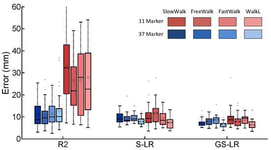 In our study, we also evaluated gaps using a smaller number of markers. Using the R2 algorithm, reconstruction of data missing resulted in mean errors more than 20 mm for all the four datasets. However, the mean reconstruction errors with the two proposed approaches provided better results, with errors less than 14 mm (Figure 4). As shown in Figure 4, our methods are robust to the reduced number of trajectories. Indeed, the improvement of S-LR and GS-LR over R2 is more important when less trajectories are available (i.e., one marker trajectory per limb, total of 11 trajectories), with mean reconstruction errors of 13.8 mm and 12.7 mm for S-LR and GS-LR, compared to 28.5 mm for R2. Thus, our numerical simulations compared with R2 algorithm showed better results regardless of the number of markers used and the type of datasets, with a reduction in mean reconstruction errors. Although in Figure 4, a visual comparison between S-LR and GS-LR methods suggests similar accuracies for all datasets, the statistical test (Table 1) indicates that GS-LR leads to smaller errors than S-LR when all marker trajectories are used (), while the difference is not statistically significant in the case of limited trajectories ( for most datasets). The results were better for the WalkL, which revealed the importance of investigating different types of walking in the solving of, as an example, the pathological gait data recovery problem. In fact, it is known that variability in gait parameters, which can be due to the type of walking (slow, fast or normal), is indicated as an important factor in fall prediction []. Accordingly, one of the most important results of this study concern the positive impact of our two proposed methods on the type of walking for various fields of application.