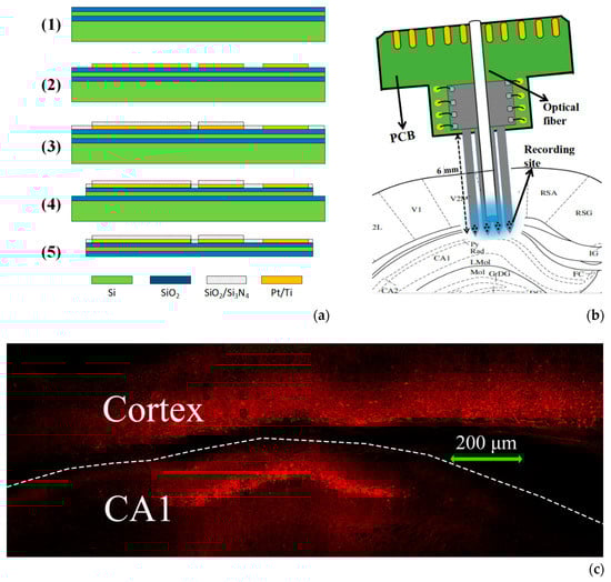 (a) Microelectrode array (MEA) manufacturing process: (1) Deposition of a layer of SiO2 on silicon-on-insulator (SOI). (2) Photolithography, sputtering and lift-off to form conductive layer. (3) Deposition of the insulating layer and exposure of recording sites and bonding pads. (4) Formation of the shape of the MEA. (5) Release of the MEA from the substrate. (b) Schematic diagram of the integrated device inserted into hippocampal CA1 of brain. (c) The fluorescence image of brain area infected by rAAV.