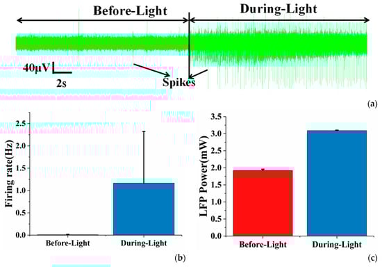 (a) The real-time recordings of electrophysiological signals before and during light illumination in viral transfection areas; (b) the average spike firing rate of neurons before and during optical stimulation; (c) the mean LFP power (0–30 Hz) of neurons before and during optical stimulation. Error bars indicate standard deviation of 3 channels.