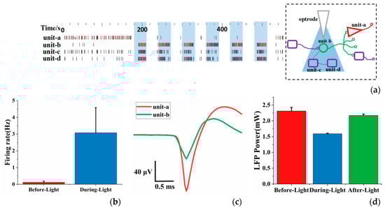 During the experiment, we attempted to analyze and study a local circuit combining optogenetics and electrophysiological recording. As shown in Figure 4a, the data was first recorded for 3 min without light, and then illumination (30 s light-on, 30 s light-off) lasting 6 min. Four neuron units were obtained (unit-a and unit-b were separated from the same recording channel) by principal component analysis and clustering from three recording channels. It can be seen from the figure that the spikes generated by unit-b,c,d increased significantly during optical stimulation. The spike firing rate of unit-b,c,d during optical stimulation was much greater than before optical stimulation (Figure 4b), which indicated that the neurons expressing ChR2 were successfully activated.