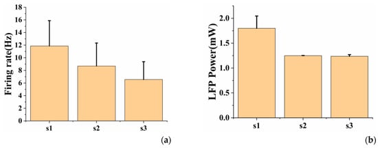 (a) The average spike firing rate of neurons under different optical stimulation patterns (s1: 10 Hz, duty ratio = 50%, 2 min; s2: 10 Hz, duty ratio = 25%, 2 min; s3: 16.6 Hz, duty ratio = 25%, 2 min); (b) The mean LFP power (0–8 Hz) of neurons under different optical stimulation patterns. Error bars indicate standard deviation of 3 channels.
