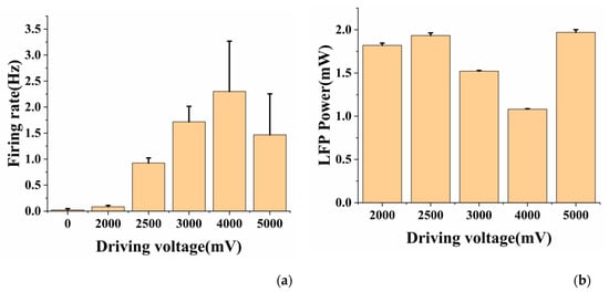 (a) The average spike firing rate of neurons under different driving voltages; (b) The mean LFP power (0–8 Hz) of neurons under different driving voltages. Error bars indicate standard deviation of 3 channels and N = 2 (N is the number of experiments).