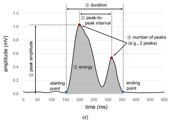 A signal processing program is developed in the present study for the acquisition, rectification, smoothing, and quantification of signals from the sensor array. First, ultrasound measurements of a particular time period are excluded as noises if those of the microphone or IMU of the time period exceed the designated values (Figure 2a). Second, all the filtered ultrasound signals are converted to positive values and then smoothed by a simple moving average algorithm (Figure 2b). Lastly, the smoothed signals are quantified by six measures (1st peak amplitude, 2nd peak amplitude, peak-to-peak (PP) interval, duration, energy, and the number of peaks) referring to Lee [43], as shown in Figure 2c. Note that peak is operationally defined as the signal finishes increasing and starts decreasing while keeping the amplitude of more than 0.1 mV, PP time interval (unit: ms) as the time interval between the 1st and 2nd peaks, duration (unit: ms) as the time difference between the starting point when the signal begins to increase above a designated level and the ending point when the signal reaches the baseline level, and energy (unit: mV2) as the sum of the squared amplitudes during the duration [44].