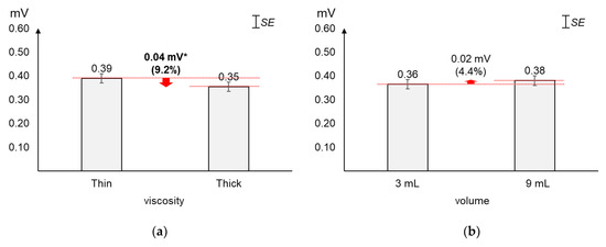 As displayed in Figure 3, the average 1st peak amplitude changed more by viscosity (23.6%~29.0%) than by volume (8.2%~16.4%). Figure 3a shows that, as compared to the average 1st peak amplitude of thin liquid, that of thick liquid significantly decreased by 23.6% (0.13 mV) for 3 mL (t[18] = 4.74, p < 0.01) and 29.0% (0.18 mV) for 9 mL (t[18] = 7.47, p < 0.01). On the other hand, Figure 3b shows that, as compared to the average 1st peak amplitude of 3 mL, that of 9 mL increased by 16.4% (0.09 mV) with significance for thin liquid (t[18] = −2.49, p = 0.02) and 8.2% (0.04 mV) without significance for thick liquid (t[18] = −1.86, p = 0.08).