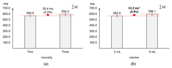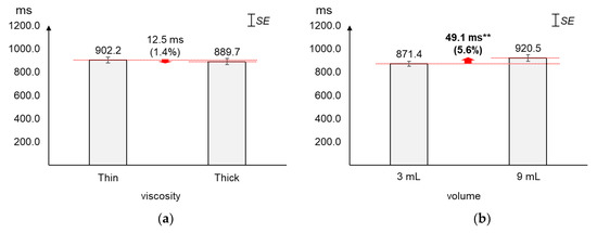 As displayed in Figure 6, the average duration increased greater by volume (5.6%) than by viscosity (1.4%). The average changes (12.5 ms) in duration by viscosity were not found significant (t[37] = 0.60, p = 0.55). On the other hand, the average duration of 9 mL was found significantly longer (49.1 ms) than that of 3 mL (t[37] = −2.79, p = 0.01).