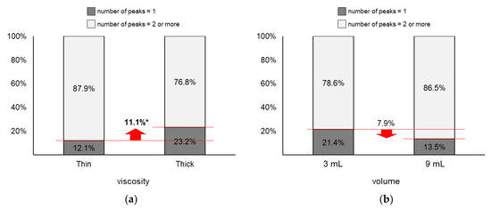 As displayed in Figure 9, the proportion of two or more peaks changed more largely by viscosity (∆ = 11.1%) than by volume (∆ = 7.9%). Figure 9a shows that the proportion of two or more peaks of thin liquid (87.9%) was significantly higher than that of thick liquid (76.8%; z = 2.03, p = 0.04). Next, Figure 9b shows that the proportion of two or more peaks of 9 mL (86.5%) slightly increased without significance compared to that of 3 mL (78.6%; z = 1.46, p = 0.15).