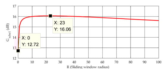 The above equation indicates that in the case of low SNR, the SNR gain of scheme 1 can be increased by reducing . A simulation is carried out to determine the value of R. In this simulation, we set . Figure 4 shows the result. As shown, when (i.e., the MA is not adopted), is only 12.72 dB, whereas when , reaches the maximum value of 16.06 dB. When , is small enough, so that the effect of on can be ignored. However, with further increase in , the loss in the signal energy due to the MA is evident, thereby reducing . To sum up, we set the sliding window radius of the MA as 23.