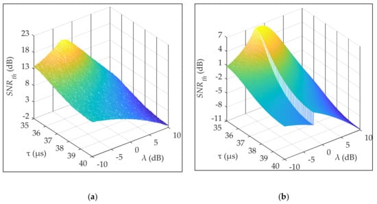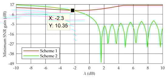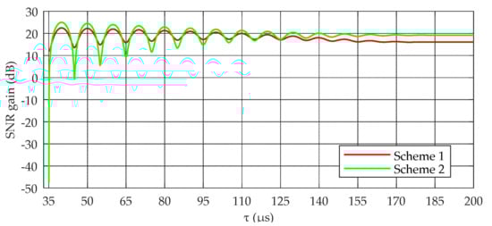 According to Equation (7), and from the above analysis process, we can easily obtain the equation for calculating the SNR gain of scheme 2, as follows: