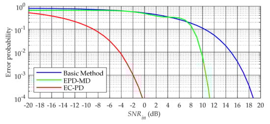 In addition, we take the SNR threshold as one of the quality parameters to compare the demodulation performances of the above three methods. The SNR threshold mentioned in this article refers to the minimum required to make the error probability no more than 10−3, and is recorded as The simulation results show that the of the EC–PD method is only −2 dB, which is 12.5 and 19.5 dB lower than that of the EPD–MD and basic methods, respectively.
