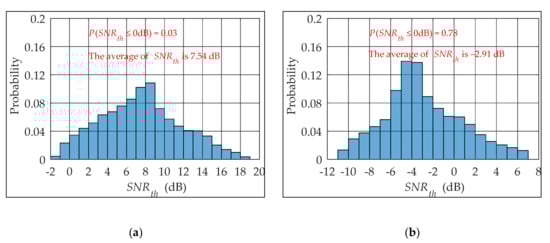 Let denote the SNR gain obtained by the EC, expressed as , where is the selector output SNR, and is the RF input SNR. Furthermore, let and denote the SNR gains of schemes 1 and 2, respectively. Evidently, and are not equivalent. The SNR gain is one of the key parameters used to evaluate the performance of the EC–PD method. Therefore, the calculation and analysis of the SNR gain will be focused upon next.