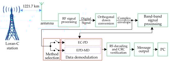 The positioning, navigation, and timing (PNT) system is the key infrastructure in any country considering national economy and security. It provides PNT services for military, commercial, and civil users worldwide [1,2]. One of the high-precision ground-based PNT systems is Loran–C, which has advantages such as long-distance propagation, low frequency, high power, and goodstability [3,4,5,6]. These features make the Loran-C an ideal backup system for the global navigation satellite system (GNSS) in PNT applications [7,8,9,10,11], especially when GNSS signals are rejected or interfered. When using the signal transmitted from a Loran-C system to implement a timing function, the receiver must determine the time deviation (TD) between the local time and the standard time. The TD is composed of the time of arrival (TOA) and broadcast time (BT) of the signal. The TOA refers to the absolute propagation time of the current Loran-C pulse group signal from the Loran-C station to the current position of the receiver. The BT, which is obtained through data demodulation, refers to the time interval between the start time of the current Loran-C pulse group signal and the standard time. Currently, the international standard Loran-C signal system typically uses EUROFIX technology for data dissemination [12,13]. The EUROFIX datalink is implemented by an additional three-level pulse position modulation (PPM) of the Loran-C pulses. The above-mentioned Loran-C signal system is adopted in China’s BPL long wave time service system and Changhe 2 navigation system [14,15].