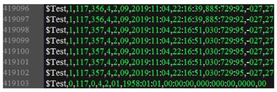 - The experimental data are composed of message frames, as shown in Figure 11. The serial port outputs one message frame to the PC every second, including $test ID, method ID (“0” references the EPD–MD method, and “1” refers to the EC–PD method), experimental period, number of correct message frames in each experimental period, message type, message subtype, station ID, time code 1 (yyyy:mm:dd), time code 2 (hh:mm:ss), precise time information (ms:μs:10ns), broadcasting deviation, and leap second. The correctness of the message frame is examined by Reed-Solomon (RS) decoding and cyclic redundancy check (CRC).
