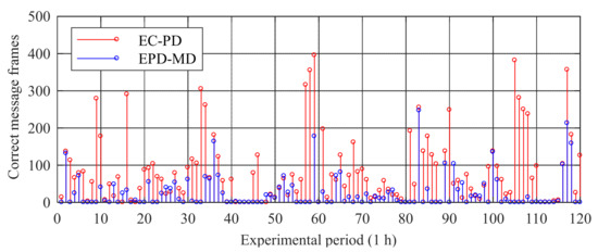 Figure 12 shows the number of correct message frames of the two demodulation methods in each experimental period. As shown, the demodulation performance of the EPD–MD method is similar to that of the EC–PD method in only a few experimental periods, whereas in most experimental periods, the demodulation performance of the EC–PD method is significantly better than that of the EPD–MD method.