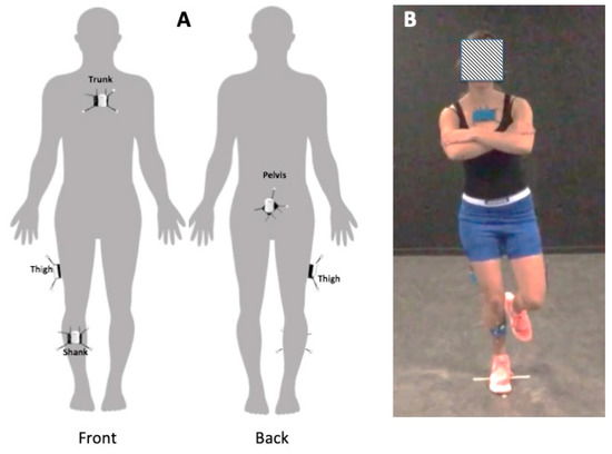(A): The ventral view (left) and dorsal view (right) show the cluster marker and sensor positions on the sternal manubrium, the sacrum, halfway on the iliotibial tract and halfway on the tibia. (B): The single leg testing position with markers and sensors attached.